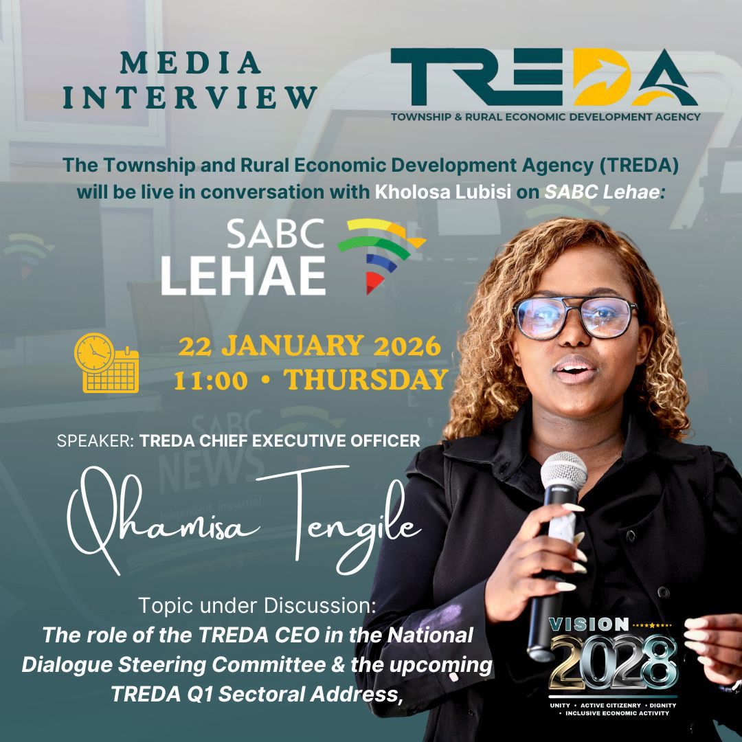 Scheduled for Thursday, 22 January 2026 at 11:00, the interview will see TREDA in conversation with renowned broadcaster Kholosa Lubisi, offering the public valuable insight into the agency’s strategic direction and its contribution to national economic development efforts.