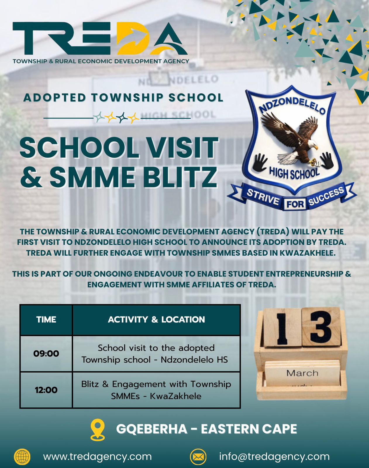 The day’s proceedings will commence at 09:00 with a historic visit to Ndzondelelo High School. During this visit, TREDA will officially announce the school’s adoption into its development program. This partnership is designed to move beyond traditional education by integrating student entrepreneurship into the high school experience.